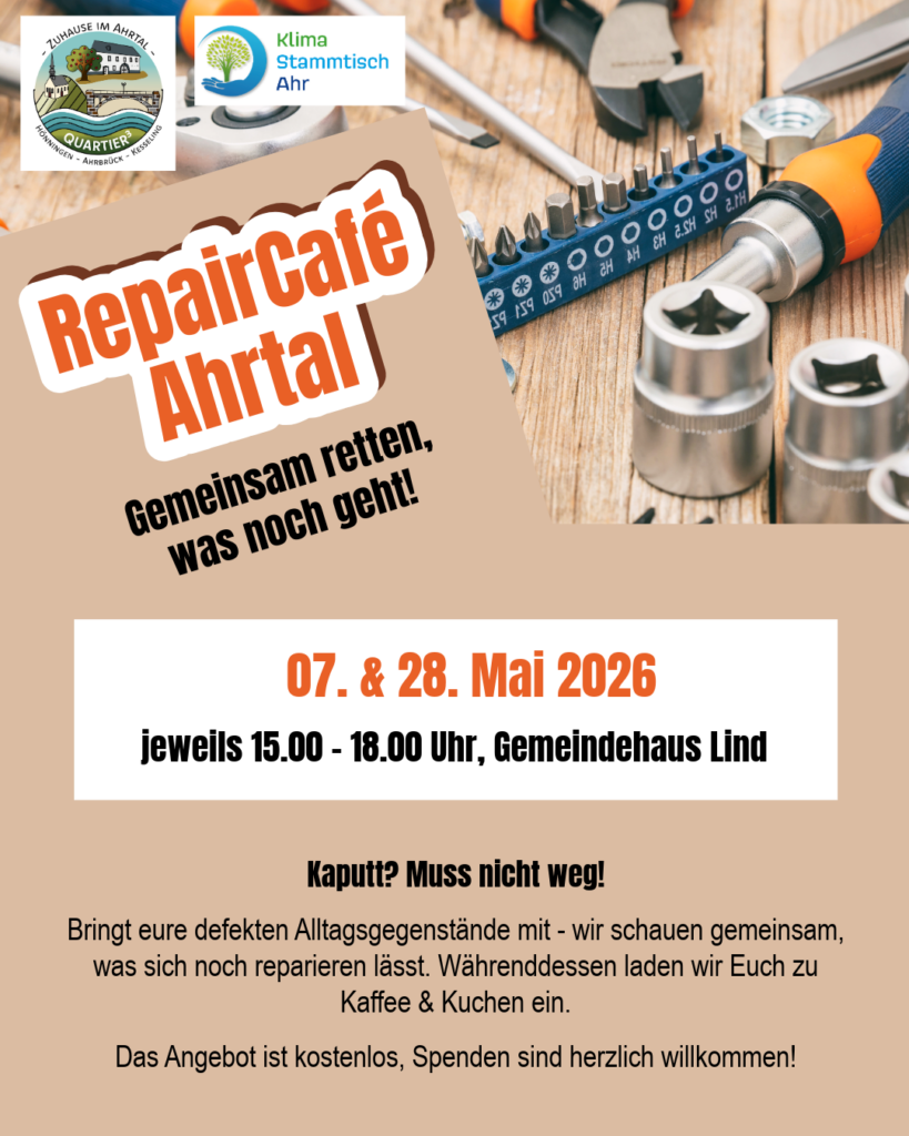 Das RepairCafé Ahrtal lädt am 07. und 28. Mai, jeweils von 15 bis 18.00 Uhr, ins Gemeindehaus Lind ein. Unter dem Motto „Gemeinsam retten, was noch geht“ können Besucherinnen und Besucher gemeinsam mit ehrenamtlichen Helferinnen und Helfern defekte Alltagsgegenstände reparieren.