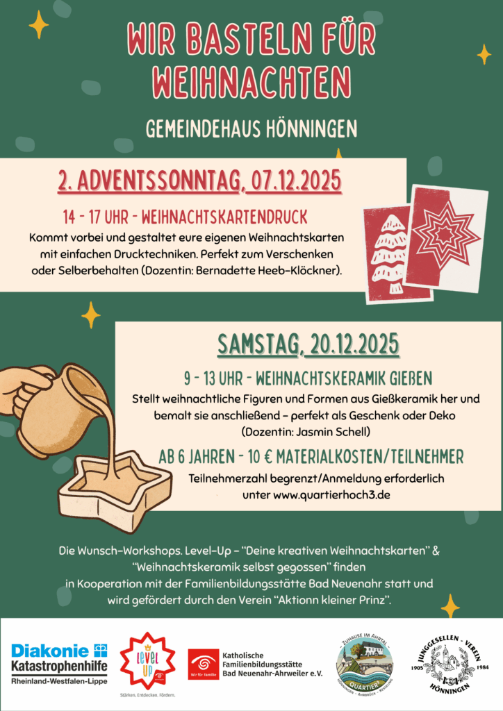 Der Wunsch-Workshop Level-Up – “Weihnachtskeramik selbst gegossen” findet in Kooperation mit der Familienbildungsstätte Bad Neuenahr statt und wird gefördert durch den Verein “Aktionn kleiner Prinz”.